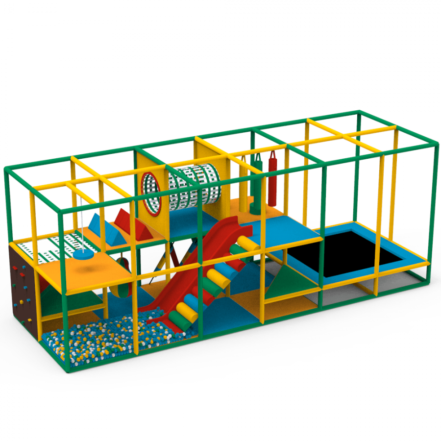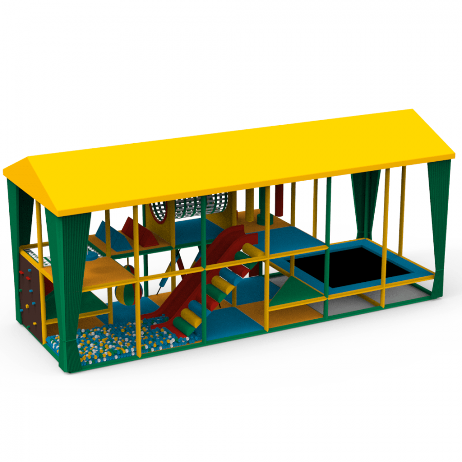 Комплекс включает разнообразные элементы: сухой бассейн с шариками, батут, скалодром и множество лазалок. Такое сочетание обеспечивает активное времяпрепровождение, развивает координацию и физическую активность детей.