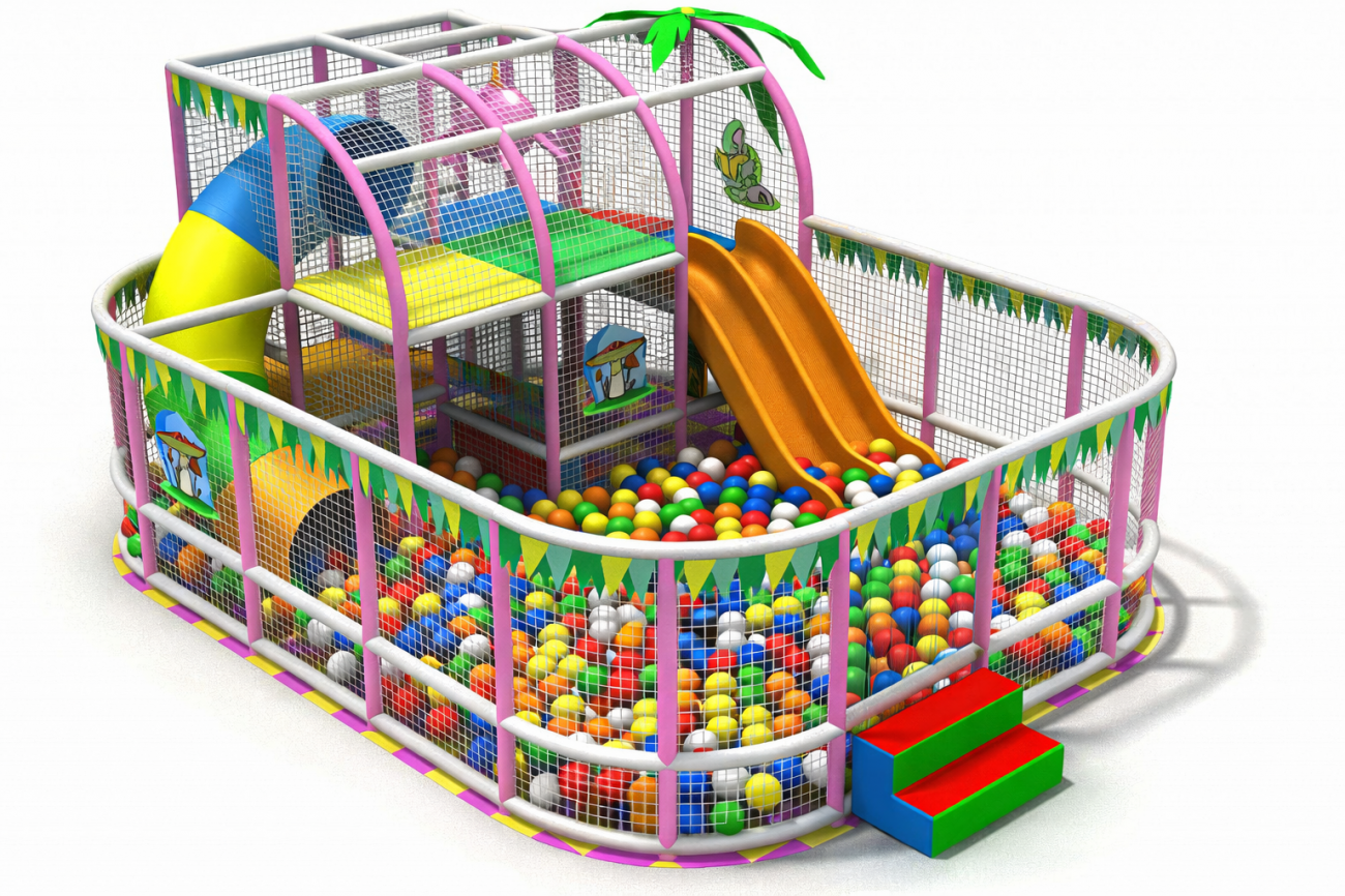 Для подъема используются лестницы в виде бревен, которые способствуют развитию координации и моторики. Дополнительно комплекс оснащен сухим бассейном, в комплект которого уже входит 18 000 шариков.