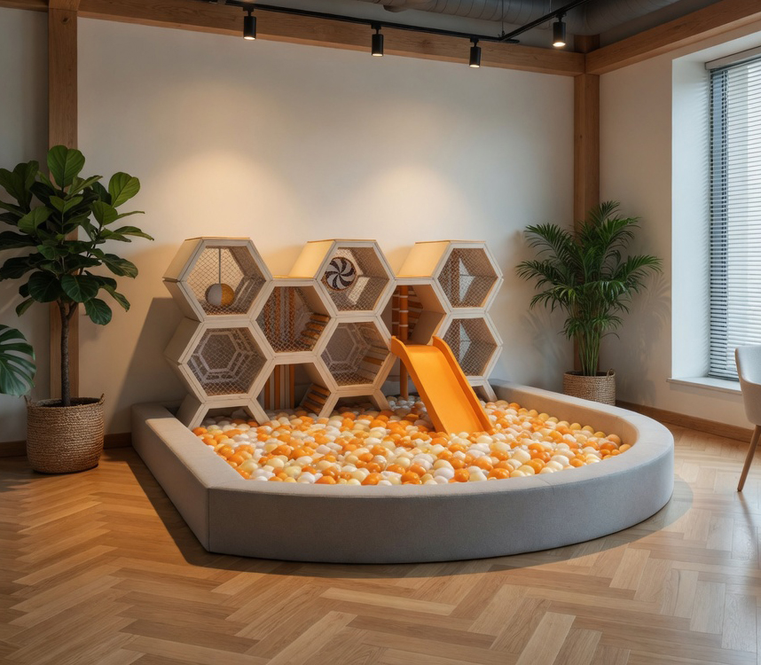 Компактный детский игровой комплекс от Happy Jump в формате сот, идеально подходящий для небольших помещений. Happy Jump Honey Mini 4.6×2.5×1.6 м сочетает стиль, безопасность и функциональность.