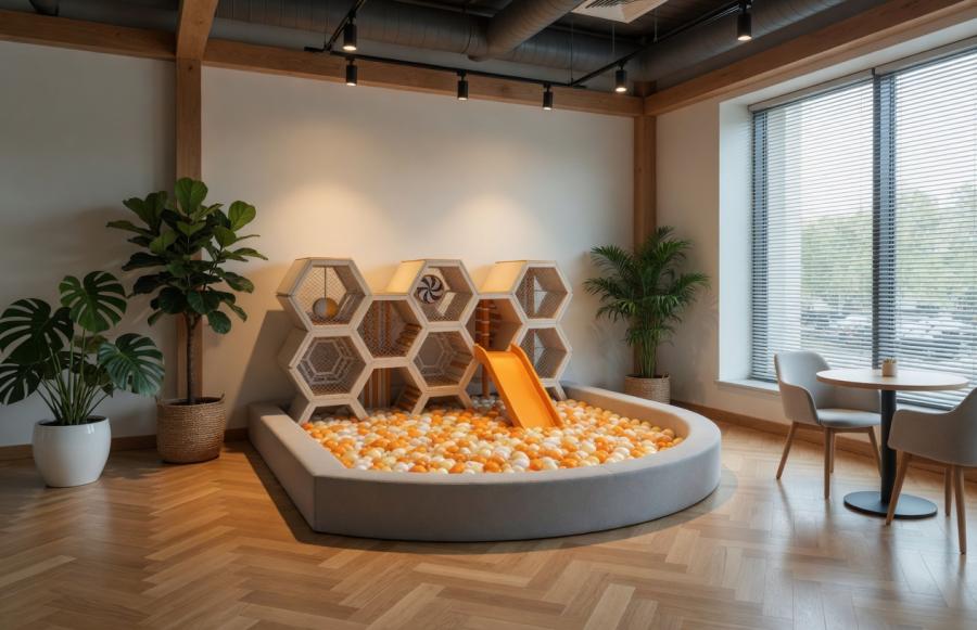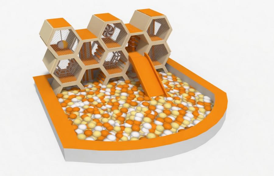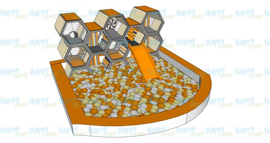 Комплекс включает шестигранные игровые модули, горку и сухой бассейн с шариками.
