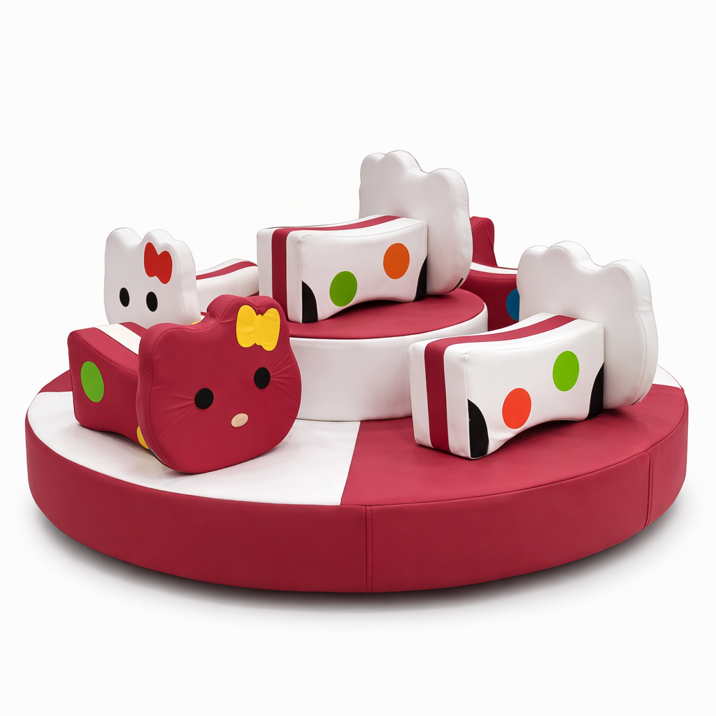Яркая детская карусель в стиле Hello Kitty с мягкими сиденьями. Отлично подходит для детских игровых комнат, торговых центров и семейных развлекательных центров.