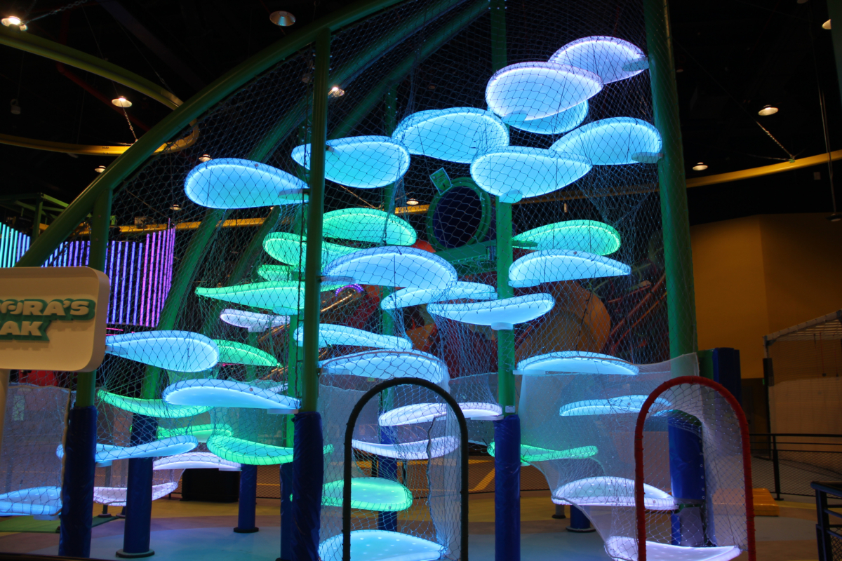 Сетчатое ограждение обеспечивает безопасность, а LED-подсветка усиливает визуальный эффект и вовлечённость.