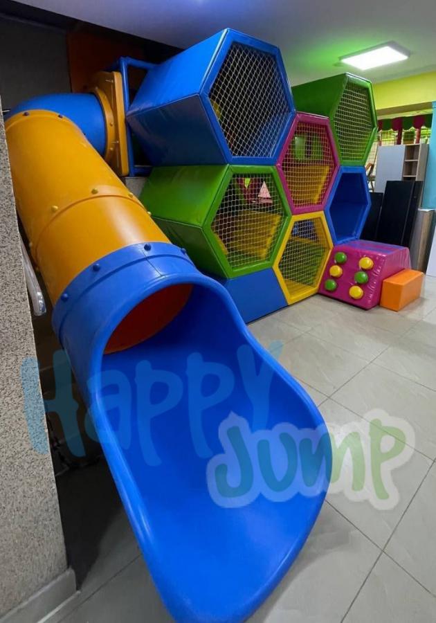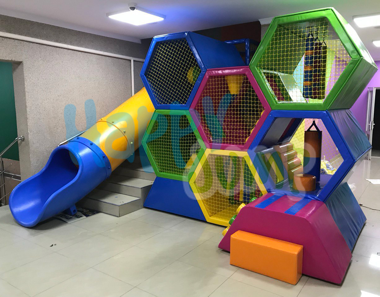 Безопасное нахождение внутри детского лабиринта обеспечивается защитной сеткой по периметру. Несколько вариантов лабиринта «СОТЫ» разработаны в цветах, максимально приближенных к пчелиным сотам в природе. Здесь нашлось место и для любимой горки, и для шариков. Дополнительным оформлением служит декорация сот и подсветка.