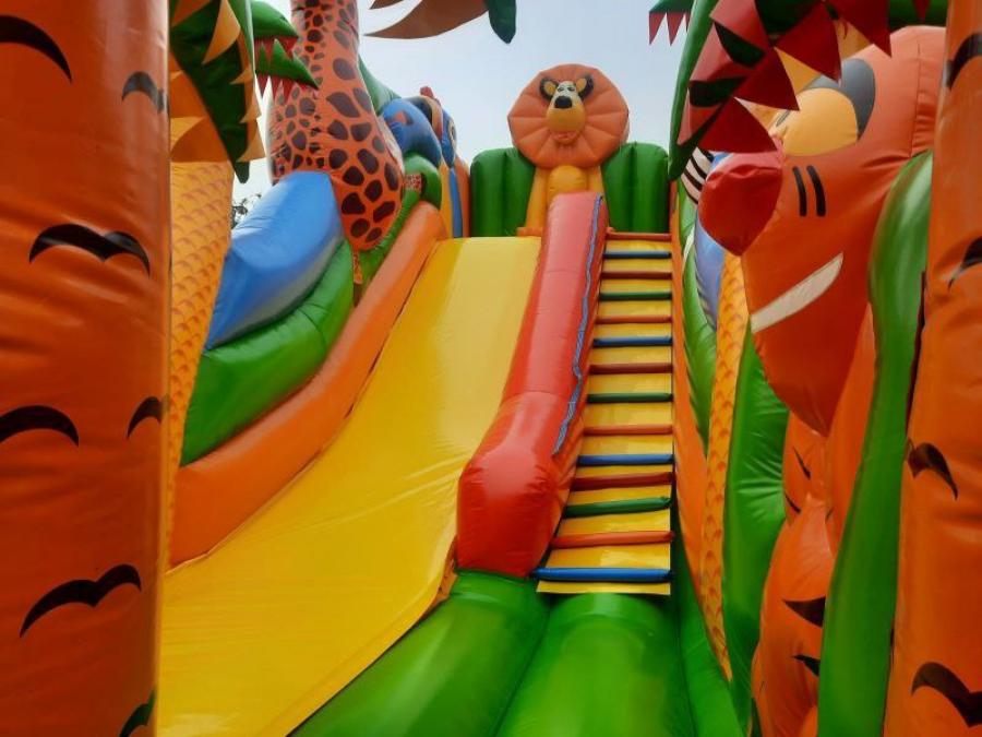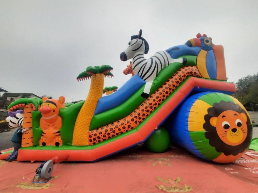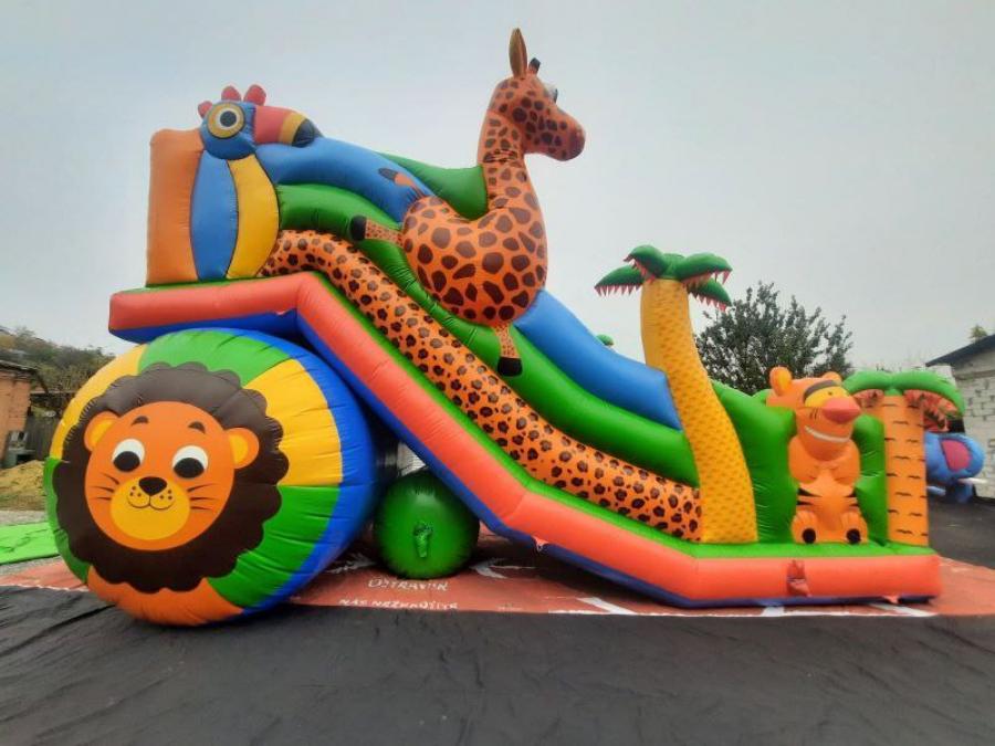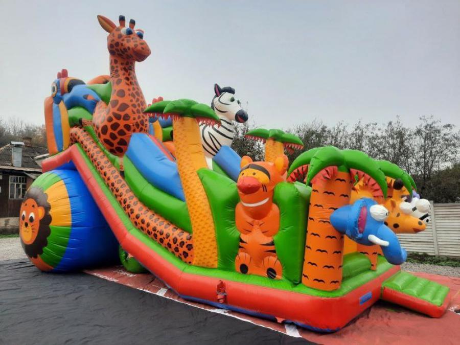 Добро пожаловать в мир веселья с надувной горкой «Мадагаскар»! Отправляйтесь в увлекательное путешествие по жаркой Африке вместе с нашей яркой надувной горкой «Мадагаскар»!